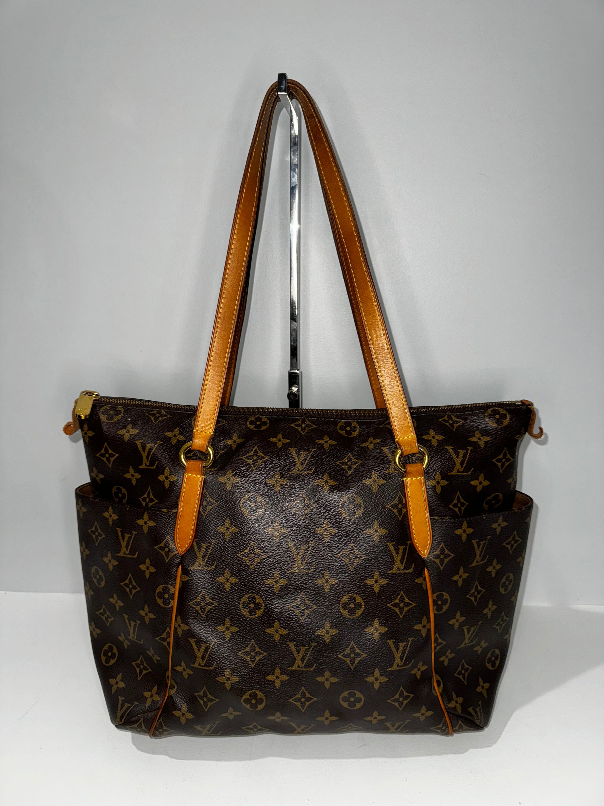 This is an authentic Louis Vuitton Monogram Totally MM tote bag, crafted from classic Monogram coated canvas. It features side bucket pockets, vachetta cowhide leather trim, and matching shoulder straps with brass hardware. The interior is lined with cocoa brown fabric. This bag is in excellent condition, with minimal signs of wear on the exterior.