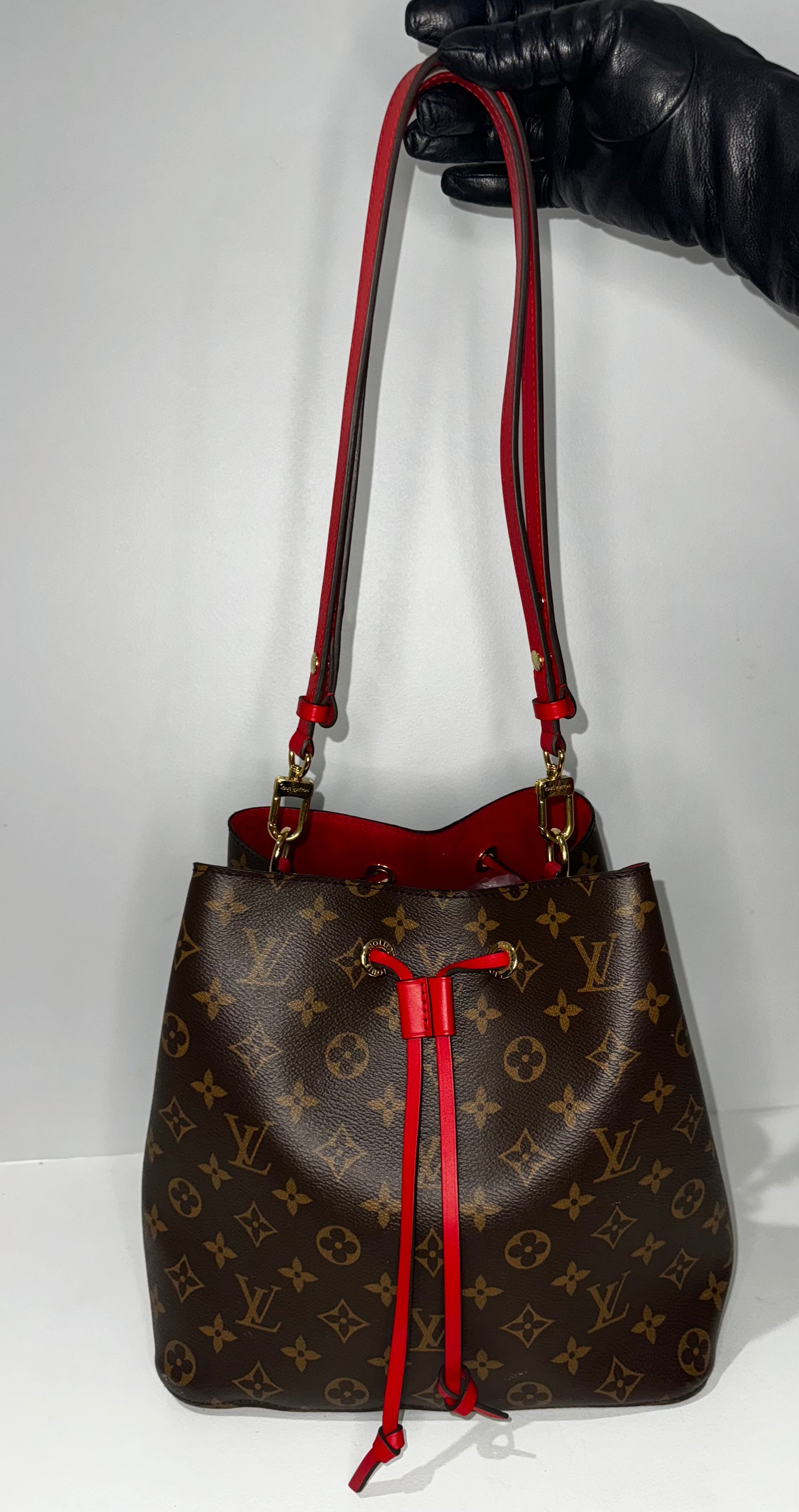 This is an authentic Louis Vuitton Monogram Neonoe MM in Coquelicot. This timeless shoulder bag is crafted from brown monogram coated canvas and features a vibrant red leather shoulder strap and top drawstring with polished brass accents. The bag opens to reveal a red microfiber interior with a central zippered compartment.